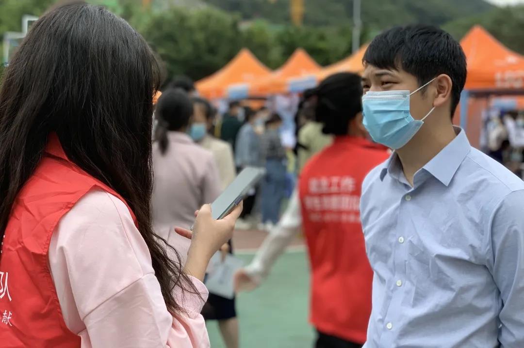 招聘会开始,应聘者早早地在体育馆门口,排成长队现场签到,接受工作人员的体温检测。队伍中有在整理简历为面试做准备的同学,也有在调整心态的同学,大家都在期待属于自己心仪的offer。前来应聘的员工大都身着正装,手持精心准备好的简历,满怀憧憬。