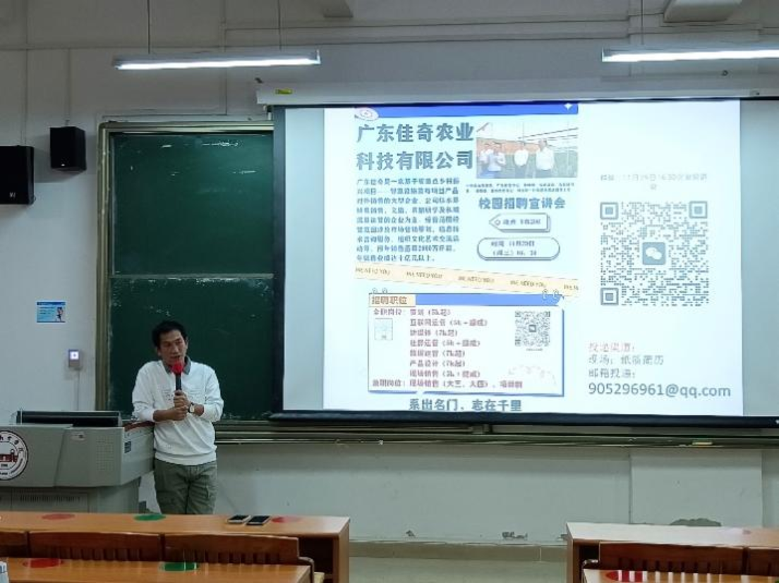 11月29日下午,广州佳奇农业科技公司校园招聘宣讲会于八教206举行。本次招聘宣讲会由佳奇农业科技公司的负责人何总主讲。