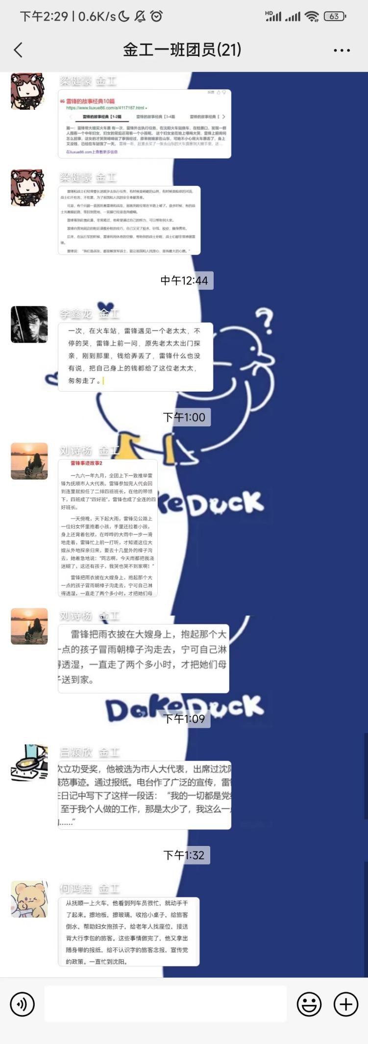 雷锋心中有爱,爱党,爱国,爱人民,心里永远装着别人,全心全意无私奉献。在其短暂的生命中,他始终用快乐与感恩诠释着对“善”的追求与执着。雷锋精神体现了一种“向上”的人生姿态。纵观雷锋短暂的一生,他始终具有一种积极主动的生活态度,对新中国、新生活充满无限热爱和美好向往,始终以饱满的热情和充足的干劲投入到工作、学习之中去。我们在线上举行会议,逐步发表了自己对当代雷锋精神的看法,同时也通过微信群聊分享了我们所知道的雷锋故事。