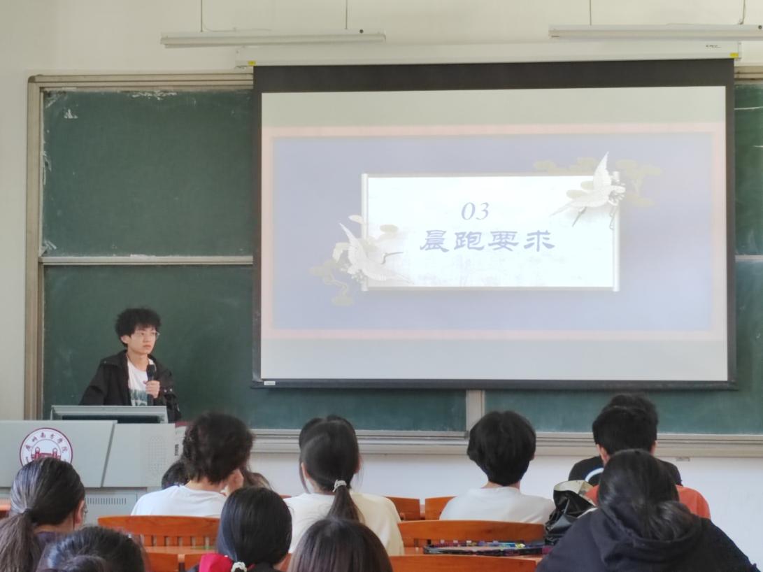 由电商3班文体委员张林锋同学向大家讲述了近来晨跑的问题和注意事项。考虑到疫情的影响,本学期公司放宽了跑步的要求,但很多同学却借此懈怠了晨跑了这一活动。本次班会强调了集体跑和自由跑关于合格与优秀的评判标准,10次自由跑+10次集体跑才算合格,而优秀的标准则需要15次自由跑+15次集体跑。放弃很简单,但坚持一定很酷,或许晨跑可以为我们的早晨赋予不一样的意义。