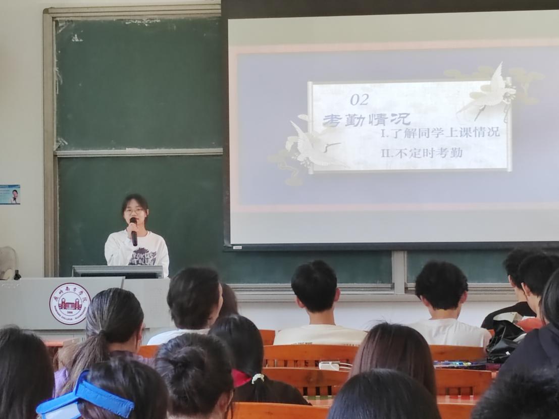 由电商2班班长叶惠同学向大家讲述了上课考勤情况。校有校纪,班有班规,按时认真完成每一堂课的学习是作为员工最基础的本职。关于考勤不可旷课、缺勤、不来等情况,有事必须提前请假,班委将及时跟进班级考勤情况,届时公司也会不定时对课堂考勤情况进行检查。若每个人都能做好自己本分,那么规则并不是枷锁的代名词。
