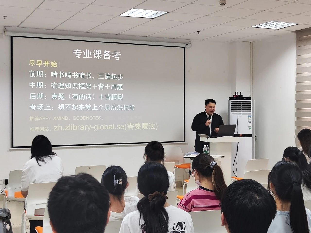 接着,张自昊同学真诚地向同学们分享了大学里面踩的“坑”,又以“为什么要考研”为题,分享自身的备考经验,帮助同学们以更好的状态去准备研究生考试。他说到,只有适合自己的,才是最好的;在别人看来,即使他的目前的现状很美好,殊不知这其中也会有迷茫彷徨、绝望甚至自我质疑,但他永远坚信“每一次的经历都在促使人不断地成长,让人在绝望中寻找到新的希望,也让人把软弱的一面深埋在心里;既然选择了远方,便只顾风雨兼程”。