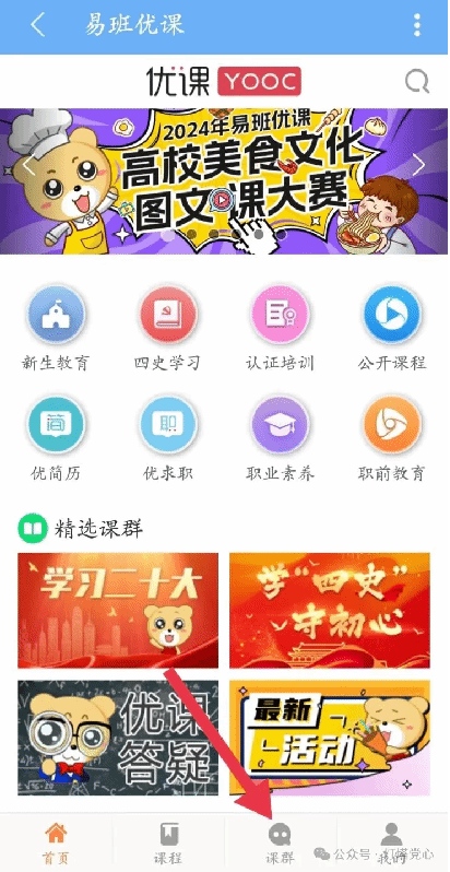 下载易班App并注册→登录进入易班→点击主页面右下角“我的”→进入个人页面后点击“易班优课”→进入优课YOOC后点击右下方“课群”进入课群主页→在课群主页中点击“添加课群”→在添加课群中搜索邀请码QF9R5YCY加入课群→加入各自对应的党支部→完成后在课群首页就可以看到线上的课程