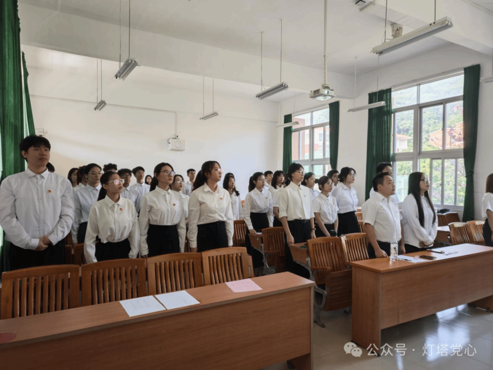 在宣读大会决议后,党支部书记陆正祥老师和党支部副书记杨丽茵老师为新一批预备党员佩戴党员徽章,并引领其面向党旗进行入党宣誓。铮铮誓言,拳拳赤诚,铿锵有力的宣言彰显了他们对党无比坚定的信仰与忠诚,表达了誓与党同心、为党的事业奋斗终身的坚定决心。