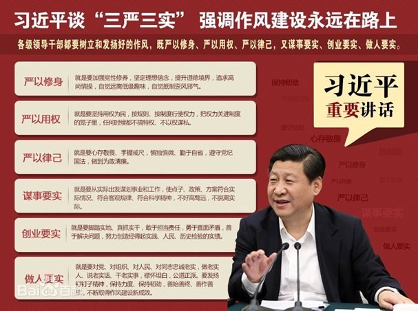 “三严三实”中的“三实”鲜明地体现了我们党的思想路线和理论原则。谋事要实,即从实际出发策划谋求发展、谋划改革等系列方针政策,使其符合实际情况、符合客观规律、符合科学精神。不好高骛远,不脱离实际,做到以责任感谋事,以力所能及谋事。创业要实,即干事要脚踏实地、讲究实效,不搞形式主义,面对是非矛盾时敢于承担使命,担当责任,勇于直面矛盾并解决问题,以实招创实绩。做人要实,即对党、对组织、对人民、对同志忠诚,做老实人、生活中工作中言行一致,光明磊落,襟怀坦白,公道正派。