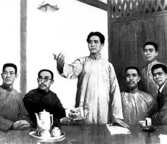 左起依次是王尽美、何叔衡、毛泽东、董必武、邓恩铭、陈潭秋