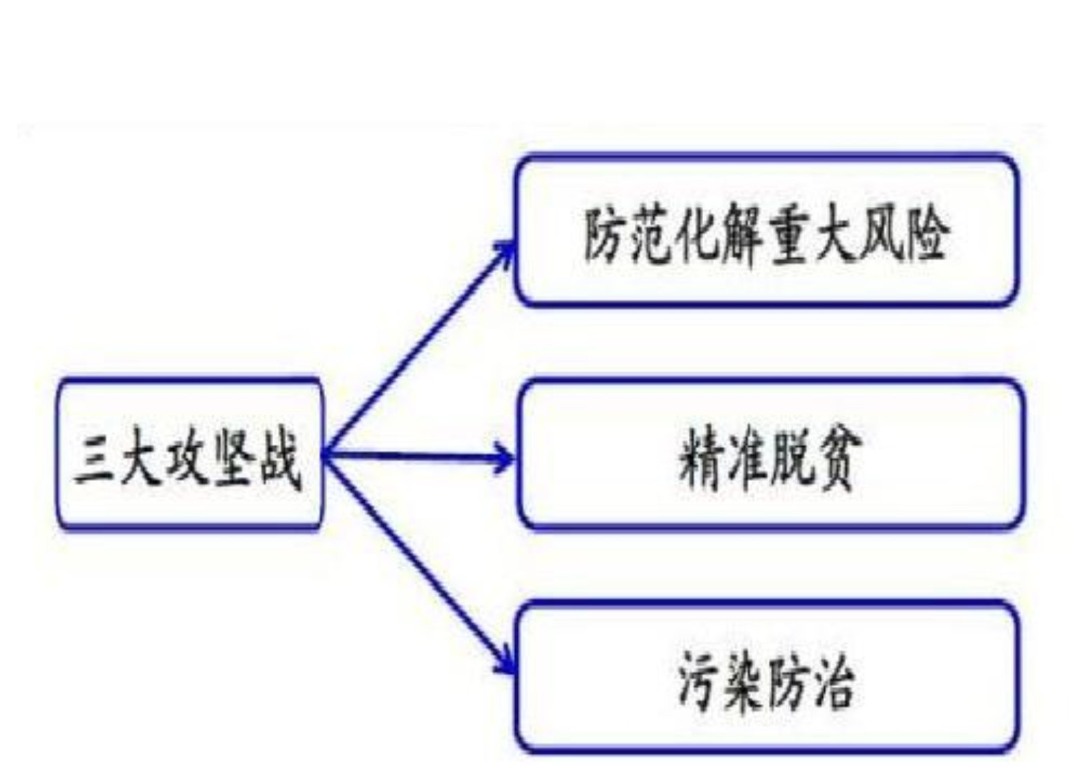 三大攻坚战是指防范化解重大风险攻坚战、精准脱贫攻坚战、污染防治攻坚战,是在十九大报告中首次提出的新表述。防范化解重大风险要使宏观杠杆率得到有效控制,金融服务实体经济能力增强,防范风险工作取得积极成效;精准脱贫要瞄准特殊贫困人口精准帮扶,进一步向深度贫困地区聚焦发力,把扶贫和扶志、扶智结合起来,激发贫困人口内生脱贫动力,巩固扶贫成果,提高脱贫质量;污染防治要使主要污染物排放总量继续明显减少,生态环境质量总体改善。