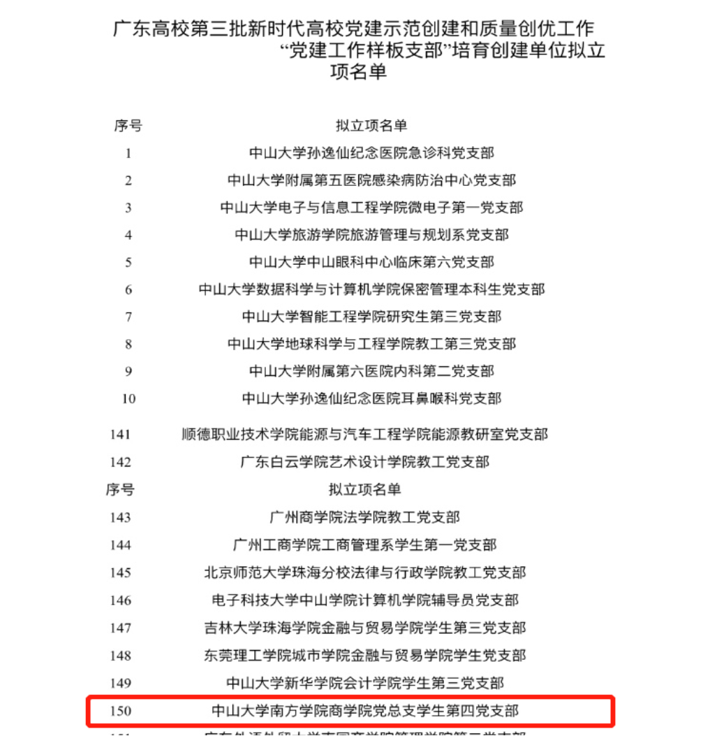2020年12月7日,中山大学南方公司太阳城娱乐员工第四党支部在“广东高校第三批新时代高公司党建示范创建和质量创优工作‘党建工作样板支部’培育创建单位拟立项名单”中光荣上榜。