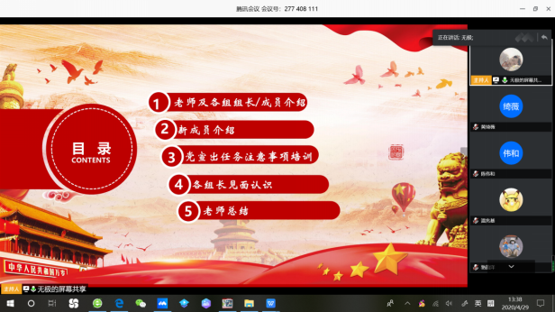 会议共有五项内容,分别为党宣的总体介绍、新成员的自我介绍、出任务的注意事项、与各组长的见面认识,以及老师总结发言。