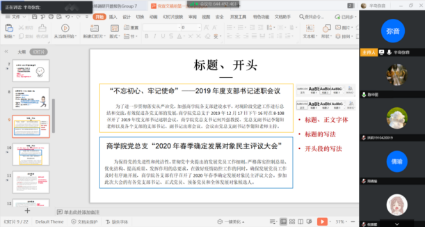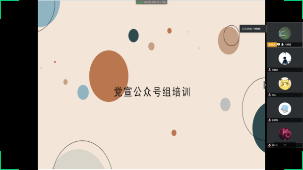 本次党宣线上见面暨培训会议顺利完成,通过线上见面和技能培训,党宣新成员们对彼此有了更深的认识和了解,有利于形成良好的沟通氛围。希望新成员们能够通过培训和练习不断加强工作效率和质量,掌握更多技能和技巧,并应用于日后的工作当中,实现集体力量最大化。