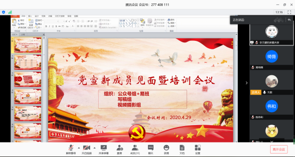 为了加强党宣成员之间的沟通交流,使得新成员更好地融入党宣大家庭,更有效地推进党组织的宣传工作,公司党总支宣传部于2020年4月29日13时30分利用腾讯会议开展了线上党宣新成员见面暨培训会议。参加本次会议的有刘梦梦老师和全体党宣成员,会议由党宣总统筹人冯俊阁主持。