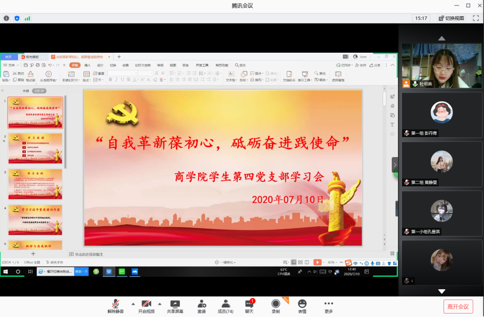 太阳城娱乐员工第四党支部以此为契机,于2020年7月10日中午12点40分通过“腾讯会议”线上视频会议的方式开展了以“自我革新葆初心,砥砺奋进践使命”为主题的支部主题学习会议。参与本次会议的人员有支部副书记张燕老师,员工党员、员工预备党员以及18级全体积极分子。