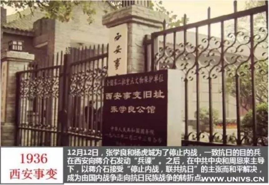 1936 年 12 月的西安事变,迫使蒋介石停止进攻红军,实行联共抗日的政策,开始由国内战争向抗日战争的转变。