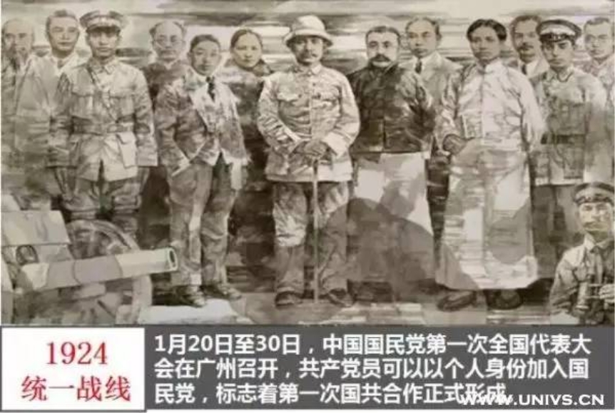 1924 年 1 月,孙中山在共产国际和中国共产党的帮助下,在广州召开了有共产党员参加的中国国民党第一次全国代表大会。这次大会接受了中国共产党提出的反帝反封建的民主革命纲领,确定了联俄、联共、扶助农工的三大政策,改组了国民党,标志着第一次国共合作的实现。