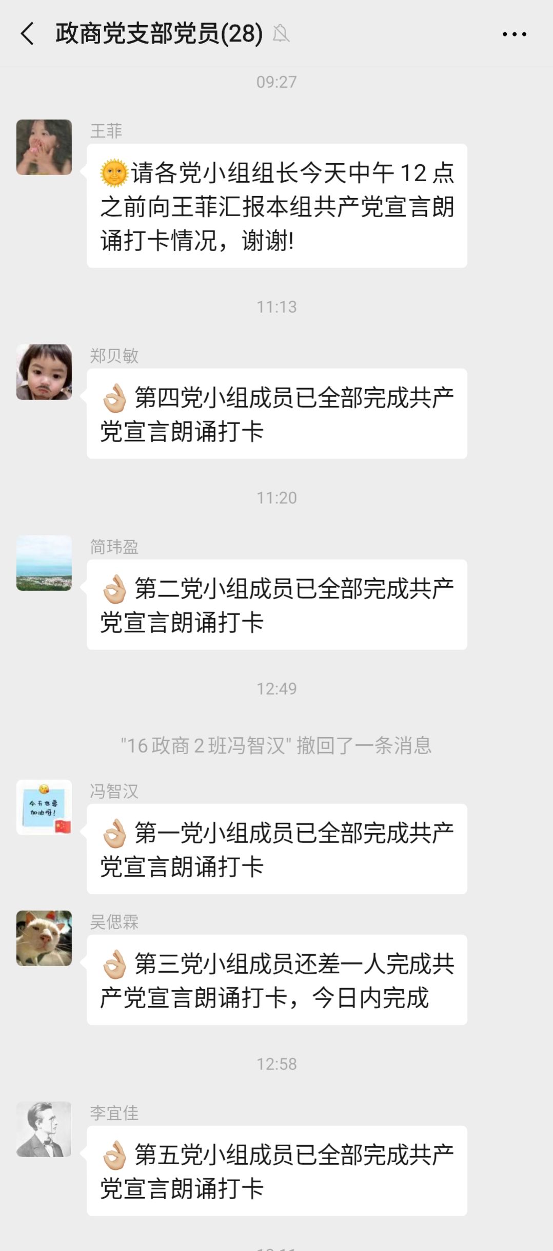 接着,汤老师对《共产党宣言》进行了更详细的介绍。她从马克思的生平事迹说起,讲述了马克思的思想是如何转变的,马克思与恩格斯是如何写出这部巨作的。在当时众多社会思潮爆发的情况下,《共产党宣言》最后之所以会被历史选择,就是因为它是马克思和恩格思在现实社会的基础,进行理论研究和理论斗争取得的。而为了坚守共产党人的精神家园,加深各位党员同志对社会主义的理解,弘扬马克思主义。政商党支部现开展“悦读”活动,支部上下全体成员在打卡小程序中上传本人朗诵《共产党宣言》经典片段。