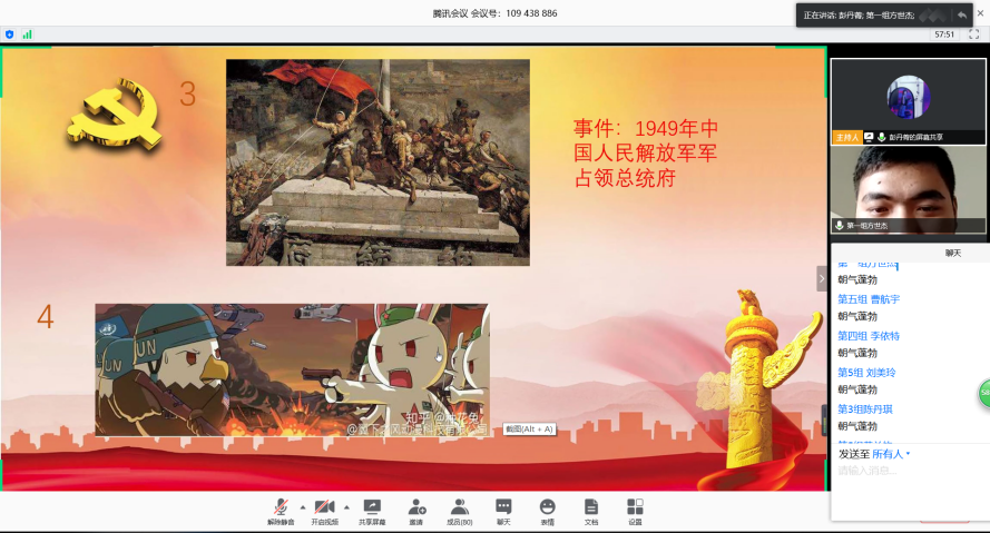 “争分夺秒”要求所有参与人员提前进行党政知识的学习与讨论,主持人在ppt上展示党政知识的相关题目后,大家在聊天会话框发送主持人所提到的关键词来进行抢答,第一位发关键词的同学视为抢答成功。每个参与人员各显神通,利用所学的知识,积极地抢答、发言。通过这样的在线抢答游戏形式,将党政知识以生动有趣的方式进行传输,活跃气氛的同时也帮助大家全面系统地了解党的历史。