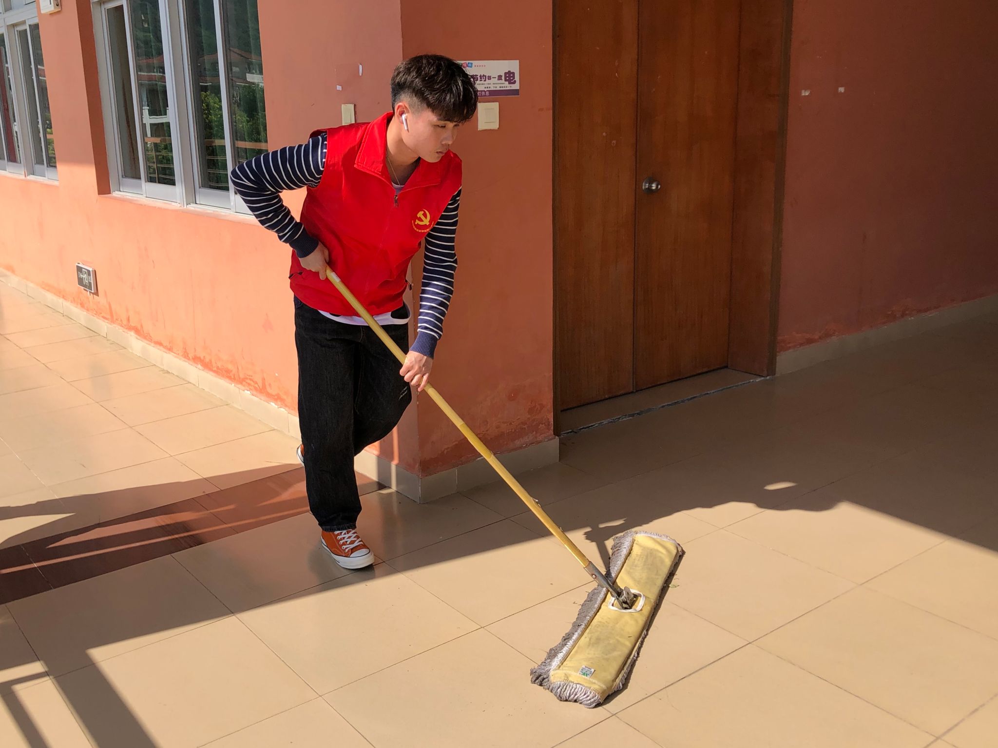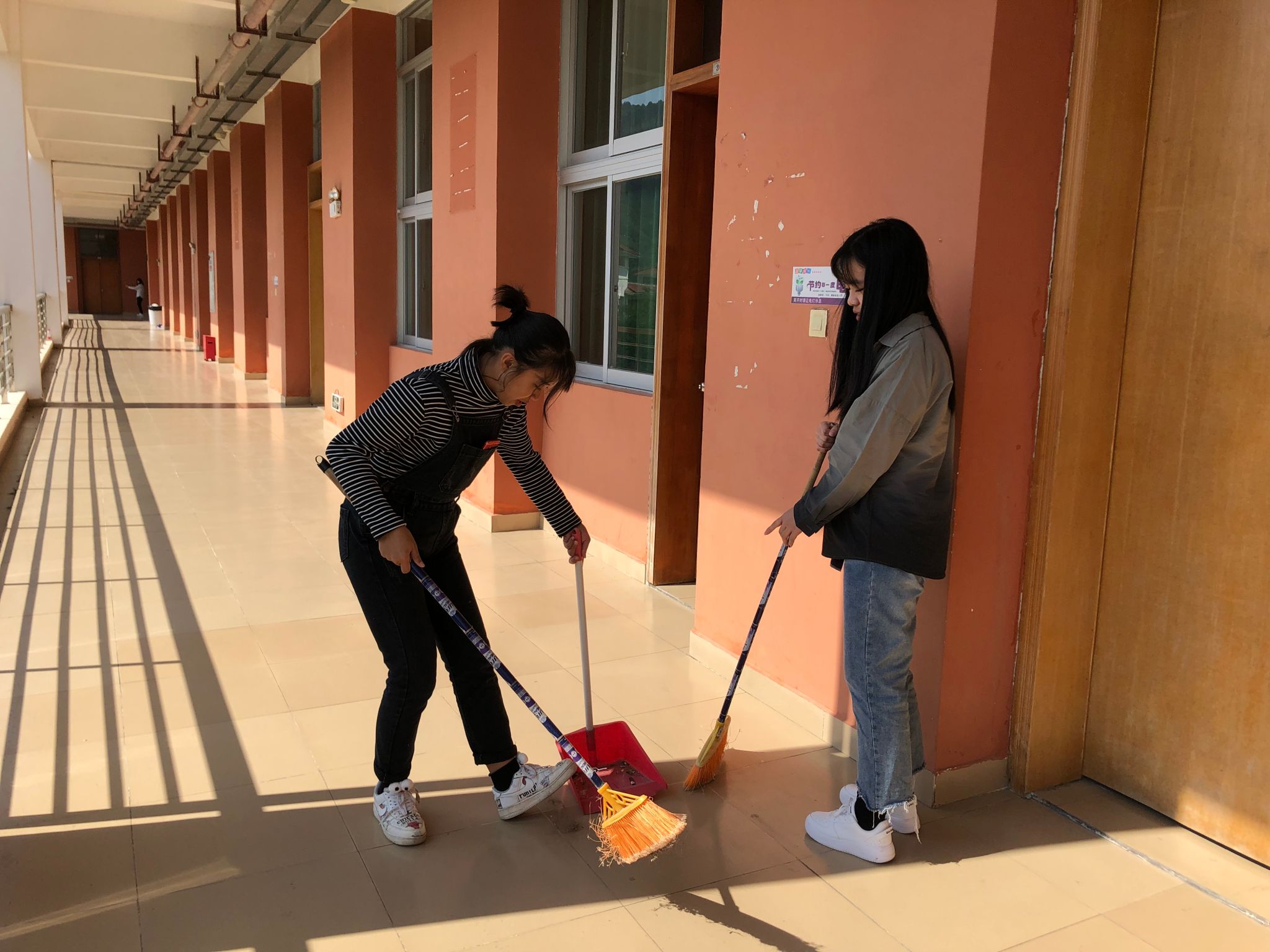 经过积极分子们高效努力的清洁,走廊上不再有散落的树叶和杂乱的纸屑,栏杆上不再有点点的灰尘与水渍。走廊和栏杆仿佛重新焕发出它原先该有的色彩和光芒,积极分子身上的红马甲也愈发明亮。