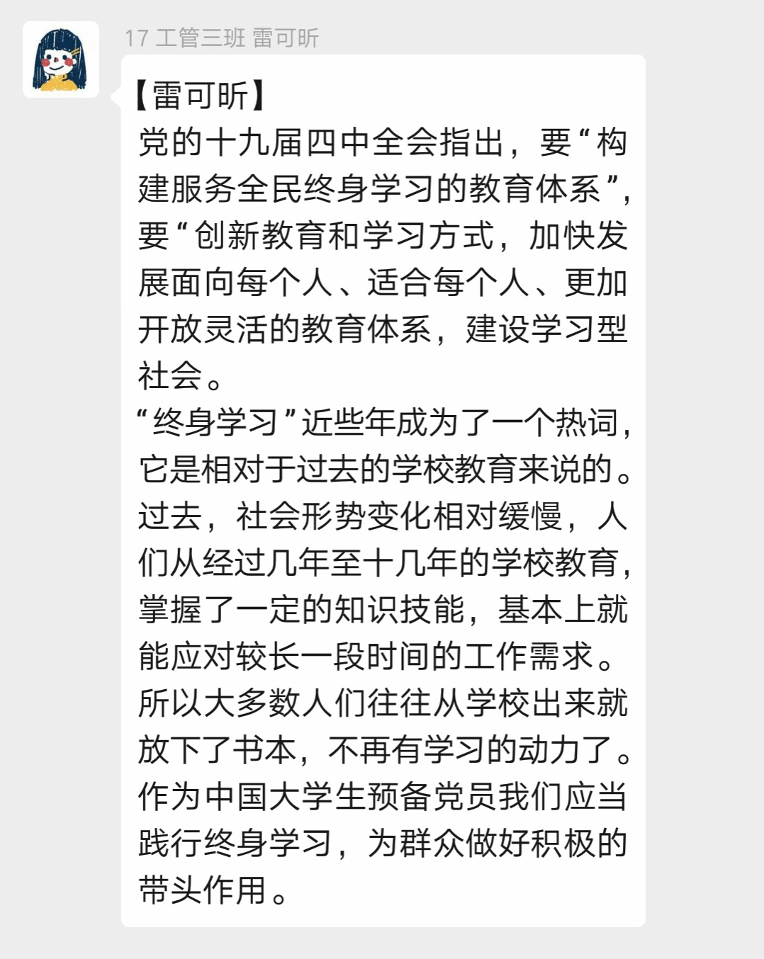 “终身学习”近些年成为了一个热词,它是相对于过去的公司教育来说的。过去,社会形势变化相对缓慢,人们从经过几年至十几年的公司教育,掌握了一定的知识技能,基本上就能应对较长一段时间的工作需求。所以大多数人们往往从公司出来就放下了书本,不再有学习的动力了。作为中国老员工预备党员我们应当践行终身学习,为群众做好积极的带头作用。