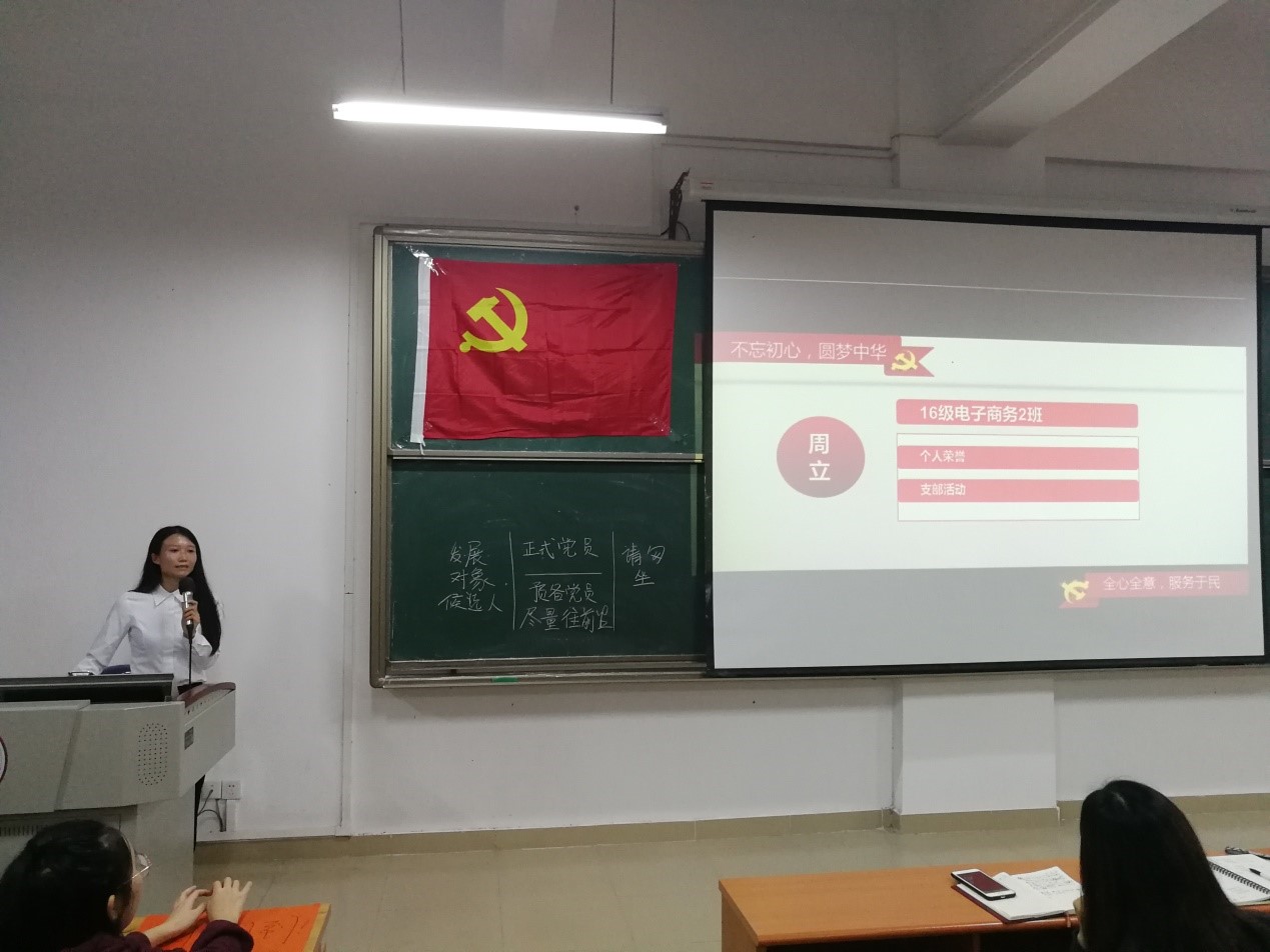 在主持人宣布大会流程后,积极分子依次上台,就本人的入党动机、学习情况、参与党支部活动等方面向在场党员展开介绍。展示中,积极分子胡楚翘阐释了自己参加党支部活动的感悟,即发扬善思善学善为之风,以实际行动落实保护校园的重任。同时,在社会实践方面用实际行动诠释了全心全意为人民服务的宗旨。