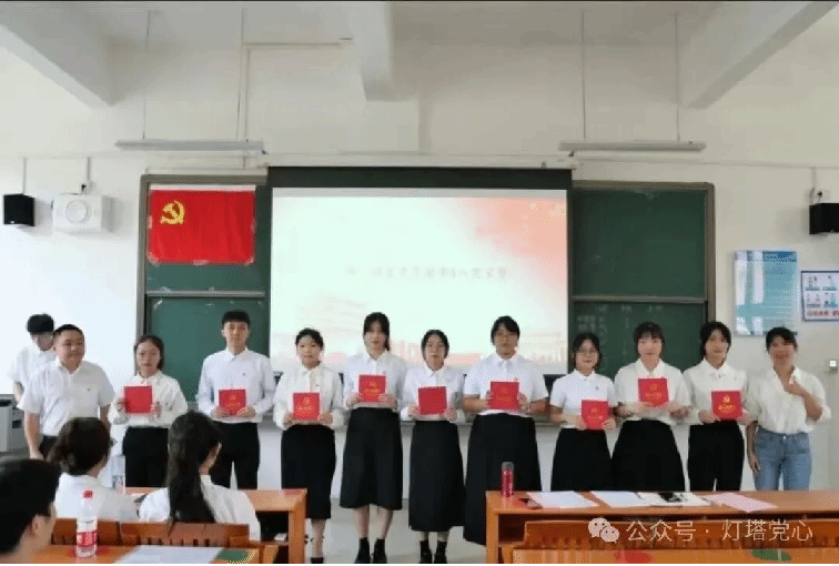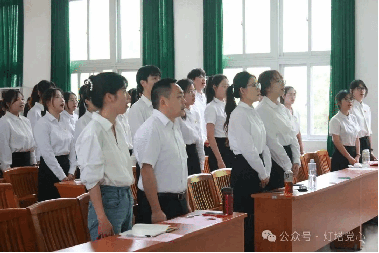 在宣读大会决议后,党支部书记张燕老师和党支部副书记陆正祥老师为新一批预备党员佩戴党员徽章,颁发政治生日卡,并带领其面向党旗进行入党宣誓。铮铮誓言,拳拳红心,铿锵有力的誓言表达了他们对党的深厚感情和为党的事业奋斗终身的决心。