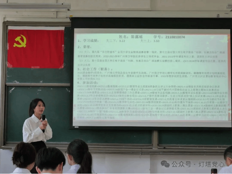 在张庭彬同志宣读大会声明后,接收预备党员议程正式开始。由陈露瑶等9位预备党员候选人依次从入党动机、个人经历、学业表现、荣誉奖项等维度进行汇报。同时,9位预备党员候选人的入党介绍人也根据实际情况,对预备党员候选人进行综合评价。