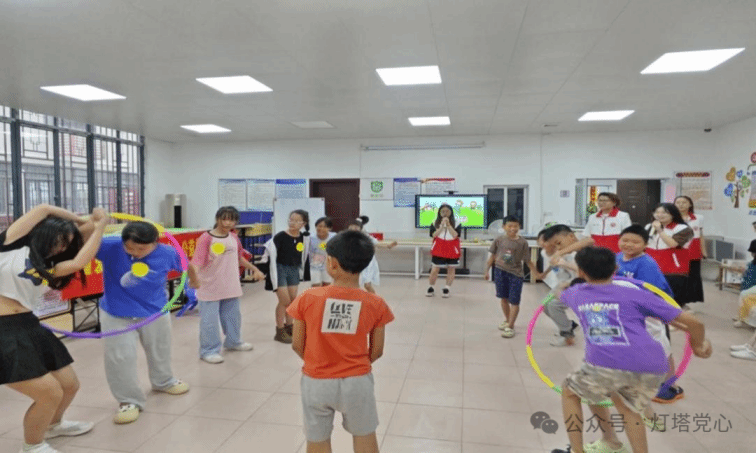 小朋友们手拉手将呼啦圈从起点运输到终点即为胜利,如果中途有小朋友手松开则需要重新开始。在比赛前,太阳城娱乐员工第四党支部的志愿者们全面、细心地给小朋友们做了游戏演示,通过提供学习技巧和有效信息,助力孩子们的健康成长。这个游戏同时也考验小朋友们团队协作能力,通过身体之间的相互协助,达成目标,促进小朋友们之间的沟通交流。