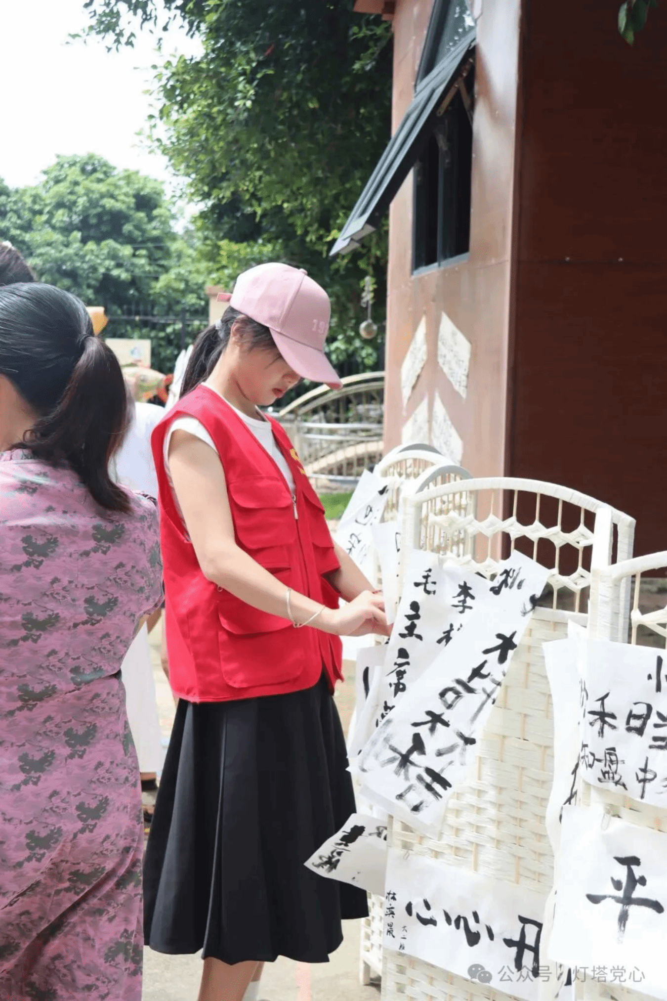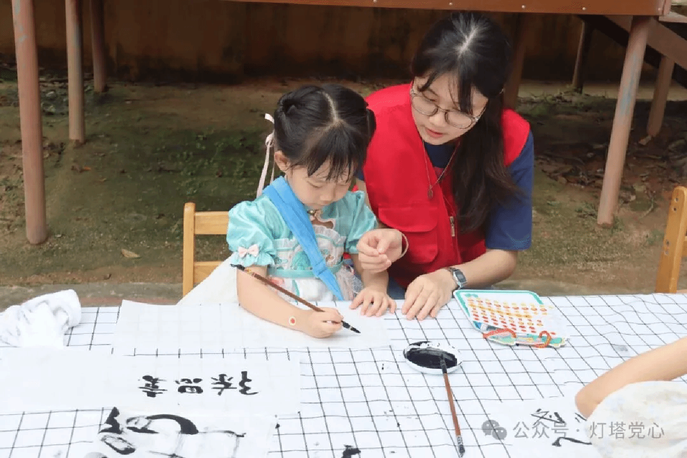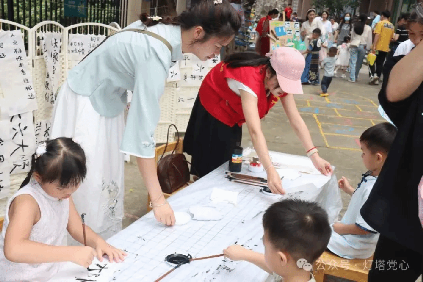 在扎染制作区,孩子们如同小小艺术家,他们精心挑选色彩与图案,随心灵触感在白布上创造出独一无二的扎染作品,每一个细节都流淌着他们对色彩与创新的独特见解。在竹编小工坊,小朋友们学习并实践着古老的编织技艺,通过指尖与竹篾的对话,体验传统与现代交织的魅力,每一件竹编作品都凝结着他们的专注与耐心。在书法区,孩子们手持毛笔,舞动着笔尖,让墨汁在宣纸上流淌,创作出漂亮的书法作品。在志愿者的耐心指导下,孩子们不仅获得了实际操作的技能,更加增进了对中华传统文化的认识和热爱。