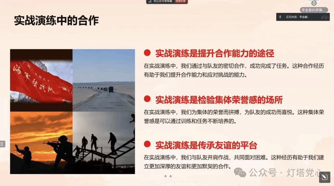 会议伊始,李金豪同志从自身出发,通过四个方面分享了自己的参军原因与选择、意义、收获以及影响,鼓励党支部成员们积极培养个人的责任感、担当精神和集体观念。