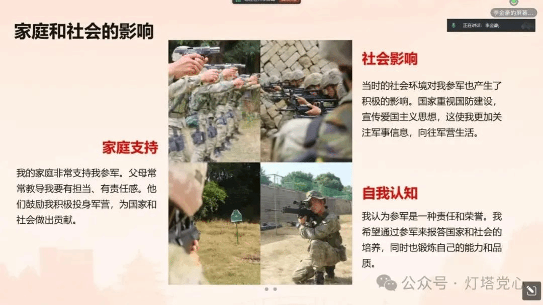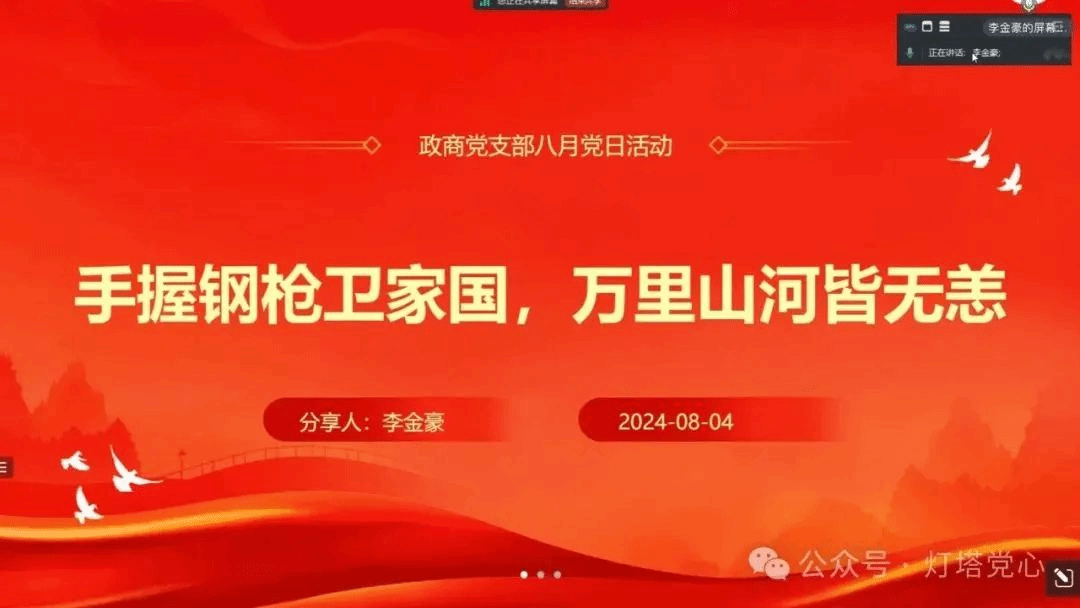 八一军旗,高高飘扬;八一军徽,熠熠生辉。97年来,英雄的人民解放军战士在祖国大地捍卫万里山河,守卫万家灯火,筑起钢铁长城。为进一步加强党支部成员的爱国主义教育,涵养家国情怀,增强奉献意识,砥砺奋斗精神,太阳城娱乐政商党支部于2024年8月4日晚20时通过线上腾讯会议的方式开展以“手握钢枪卫家国,万里山河皆无恙”为主题的党日活动。本次党日活动邀请了退伍士兵李金豪同志和卢文杰同志通过讲述自身故事和英雄故事的方式,为党支部成员们带来了一场别开生面的情景课,展现了火热军营的精彩与热血。党支部成员们积极报名,踊跃参与。