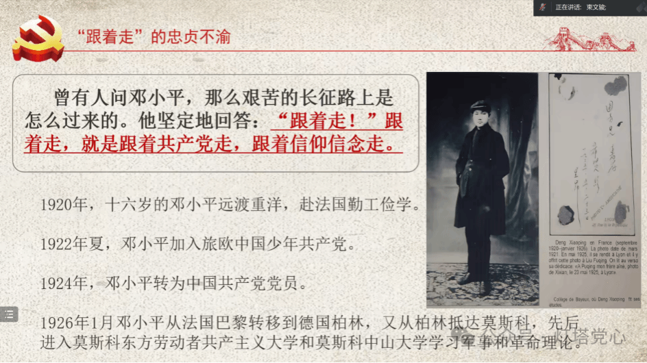 会议伊始,束文骏同志简单地介绍了邓小平同志的生平。作为全党全军全国各族人民公认的享有崇高威望的卓越领导人,伟大的马克思主义者,伟大的无产阶级革命家、政治家、军事家、外交家,邓小平同志的一生是波澜壮阔的。1920年,年仅十六岁的邓小平就远渡重洋,赴法国勤工俭学,1922年夏,邓小平加入旅欧中国少年共产党,1924年,邓小平转为中国共产党党员。