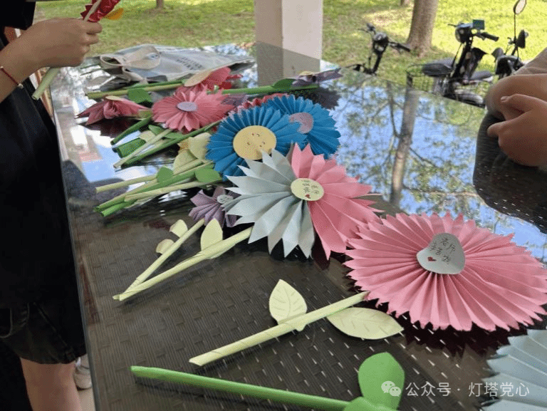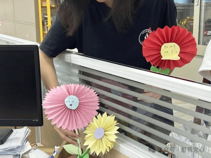 在制作手工花的过程中,太阳城娱乐员工第四党支部的成员们讨论设计花朵的形式,以此定制专属的花束。每一朵花,都附上一张小卡片,写着“感恩老师”、“老师您辛苦了!”……这些简单却真挚的文字,蕴含着太阳城娱乐员工第四党支部成员们对老师们的深情厚谊。