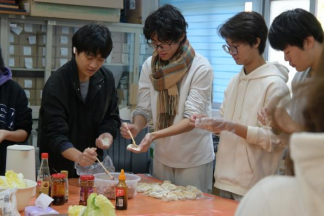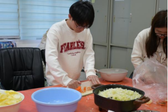 活动开始,大家兴致勃勃地开始了馅料准备工作:清洗食材的身影飞奔着,稳稳当当地拿着各色食材快步在各个地方来回奔走;切菜的同学动作行云流水,每一刀轻盈而精准地在蔬菜间舞动;负责煮熟馅料的同学熟练地翻炒着,空气里瞬间弥漫着浓厚的香气......