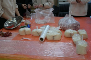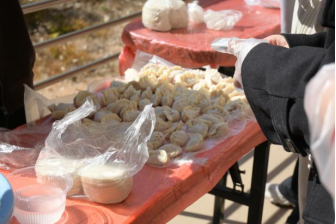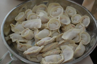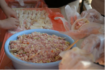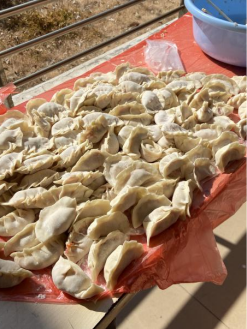 接下来就到了最最最最重要的包饺子环节,大家齐心协力把所有的馅料搬到桌子上,便开始包饺子。