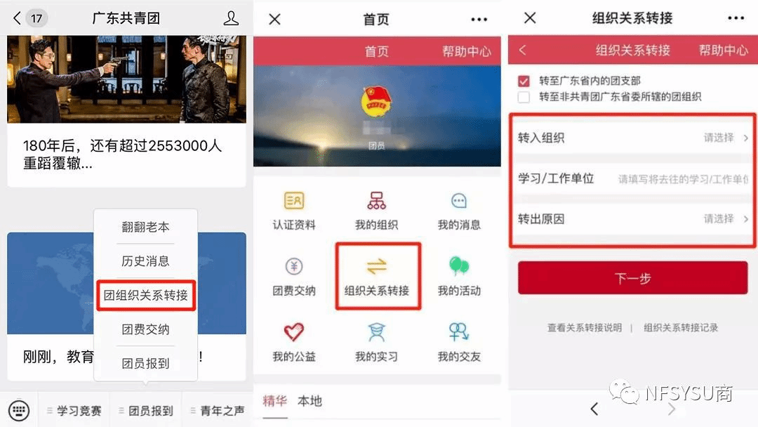 ①在本公众号“广东共青团”菜单栏点击“团组织关系转接”——“组织关系转接”