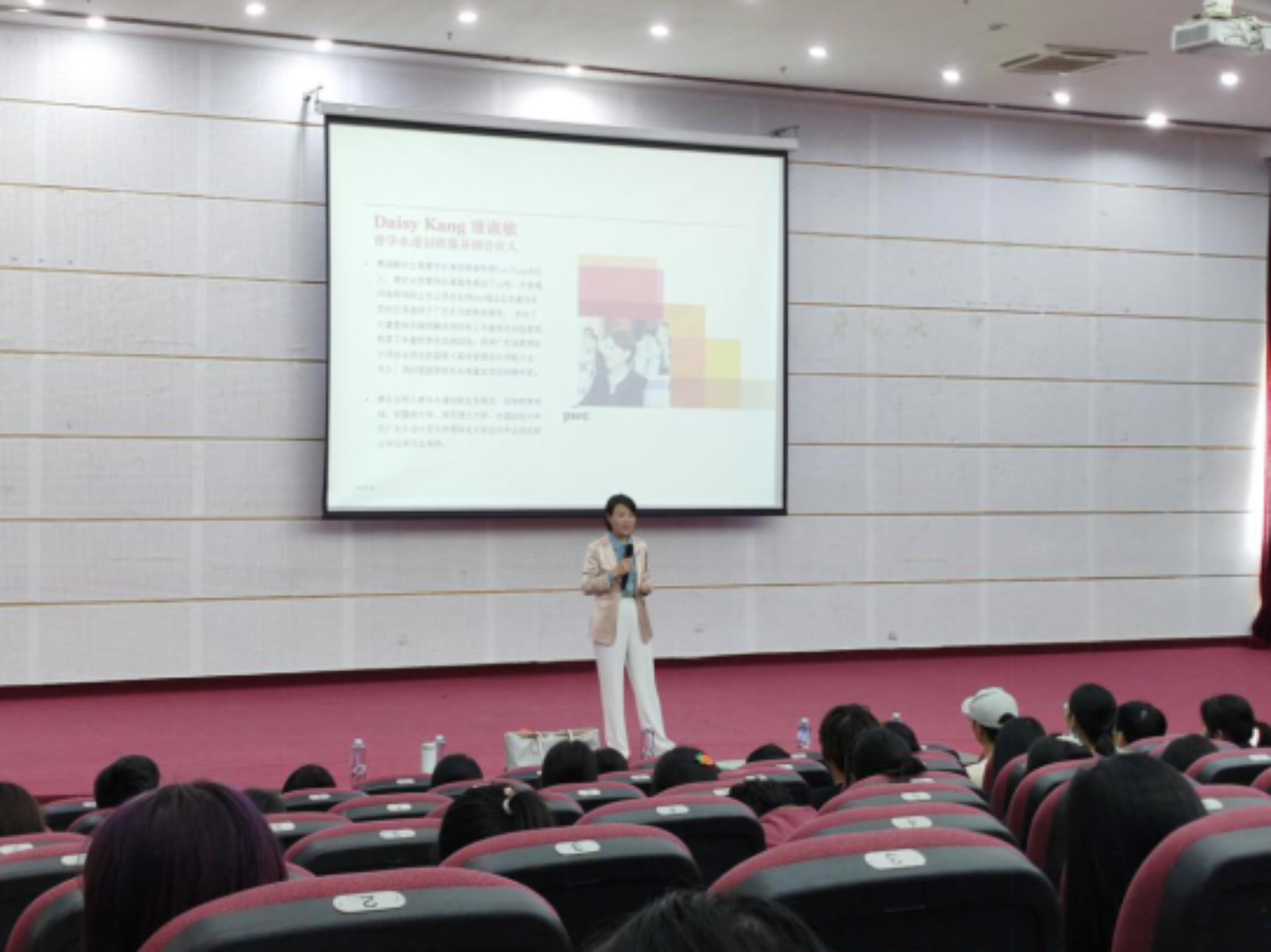 讲座伊始,普华永道合伙人Daisy Kang向同学们讲述求职实习的流程以及求职通关的小窍门,帮助同学们了解行业的发展。康老师通过列举普华永道招聘安排及要求和线下实战案例,让同学们深入了解普华永道的培训。