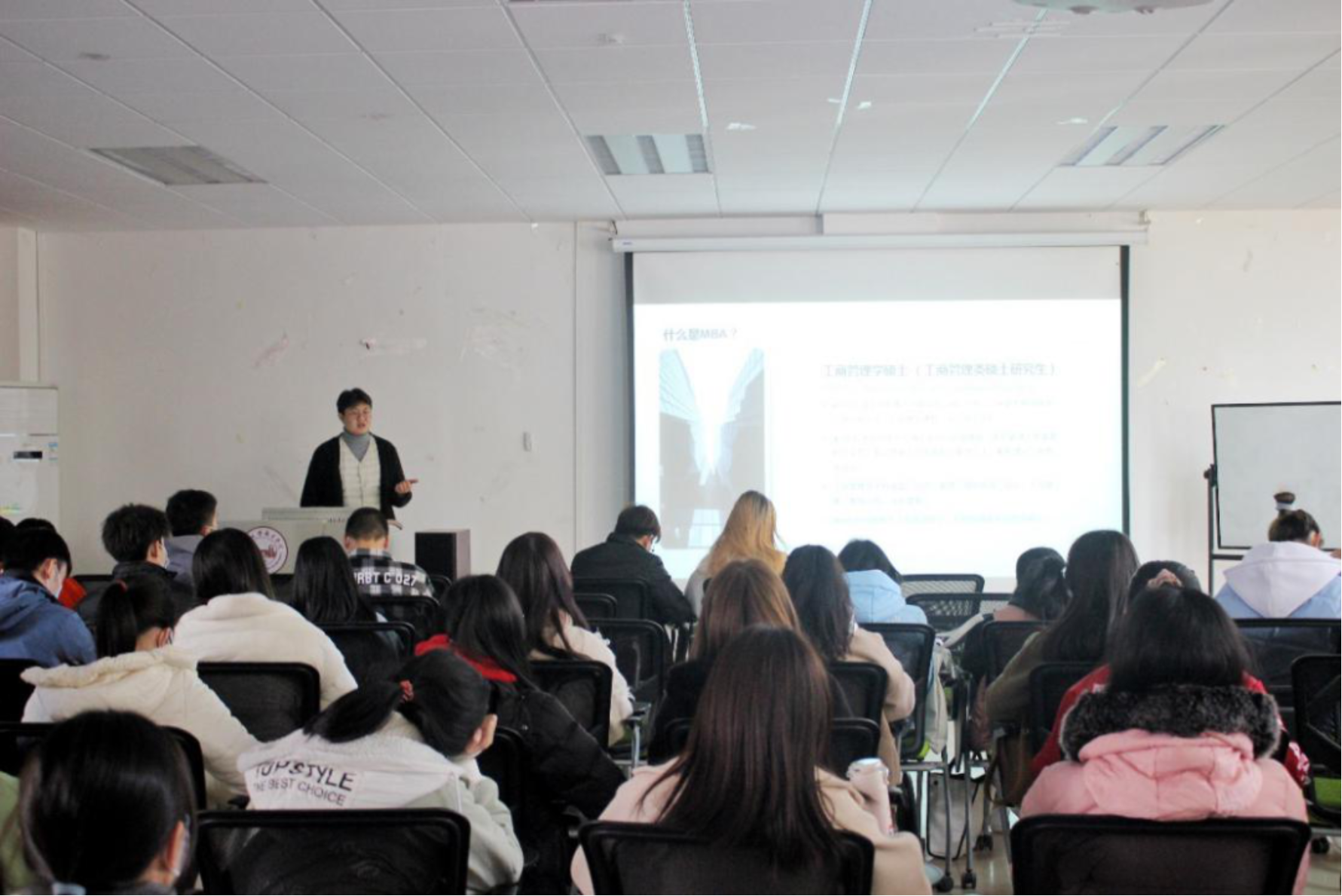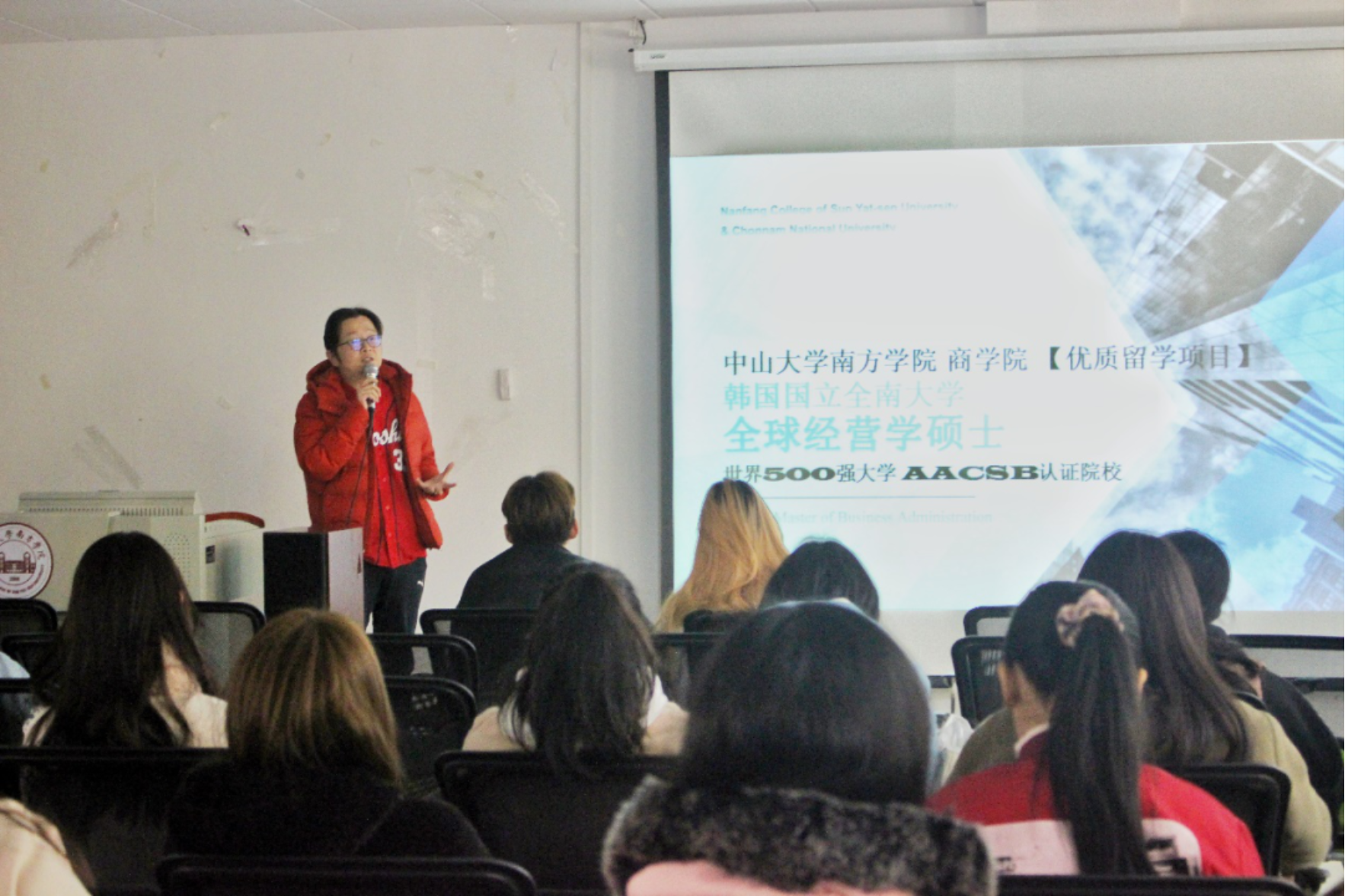 高斌斌老师通过韩剧和电影等方式带领参会同学了解韩国国立全南大学MBA项目,并且介绍了该校入学要求、相关课程、团队团队等资讯。随后,高老师分享了自身的经历,让同学们切身感受到在韩国留学的优势以及就业要求。