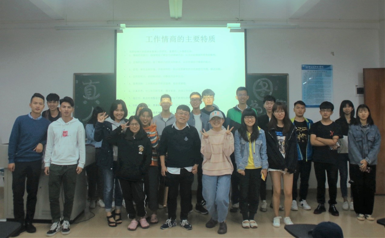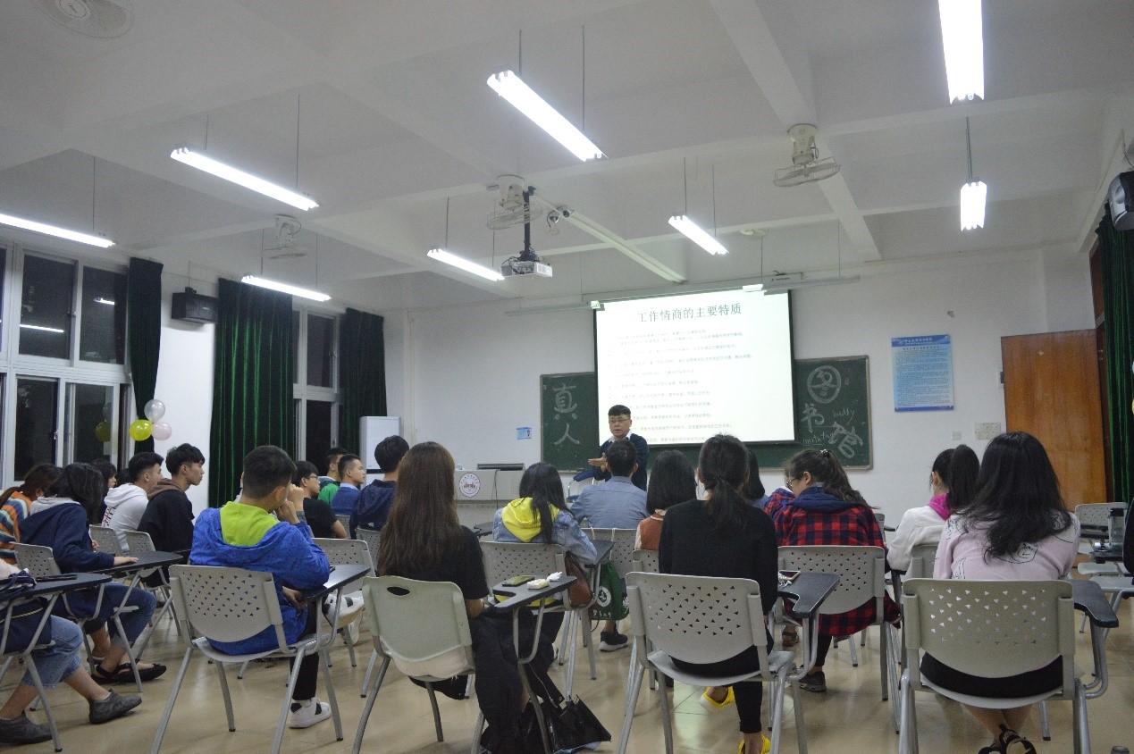 活动伊始,于202室进行的演讲主讲人为吴宏哲老师。吴宏哲老师用轻松、幽默的方式引入本次主题——老员工应该具有的情商,以真实事件为例,给同学们例举情商低的的坏处。经过他极富感染力的牵动,现场氛围逐渐融洽。