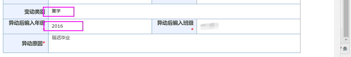 4、留级、跳级的变动类型是“年级调整”,异动编入后年级不应该是原年级。