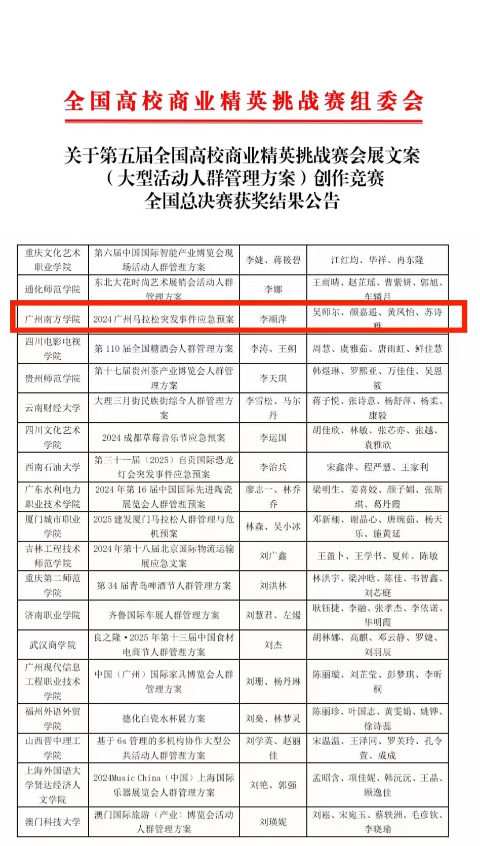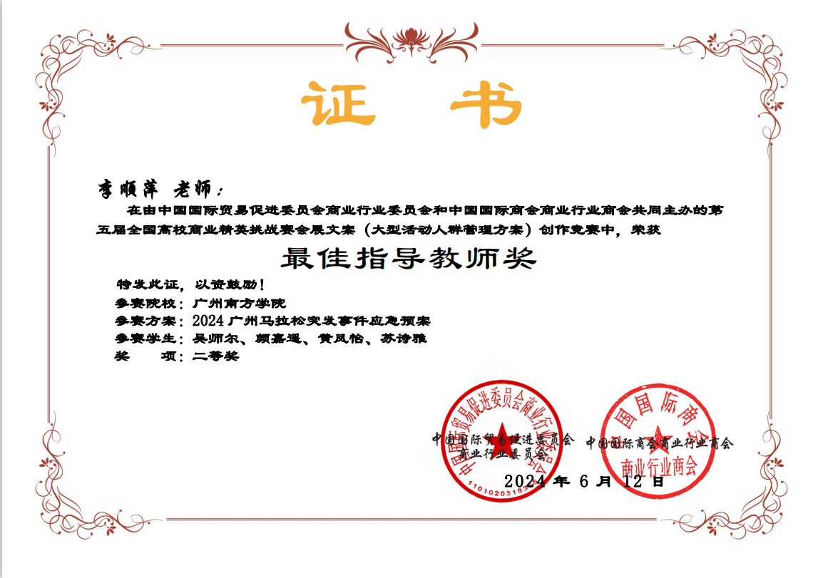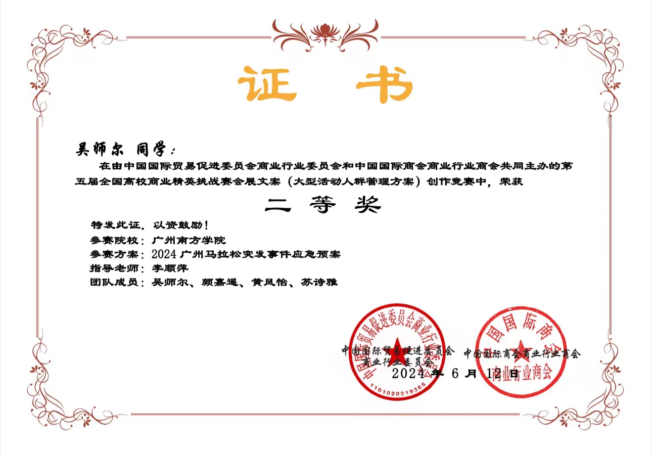 公司来自国际经济与贸易专业的吴师尔、颜嘉遥、黄凤怡、苏诗雅四名同学组成参赛队伍——“活力飞豹团”,在李顺萍老师指导下,参赛作品为——《广州马拉松突发事件应急预案》,荣获本次竞赛全国二等奖佳绩,团队努力数月,辛勤付出,终不负所望!