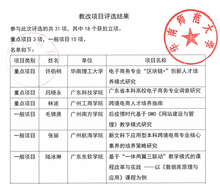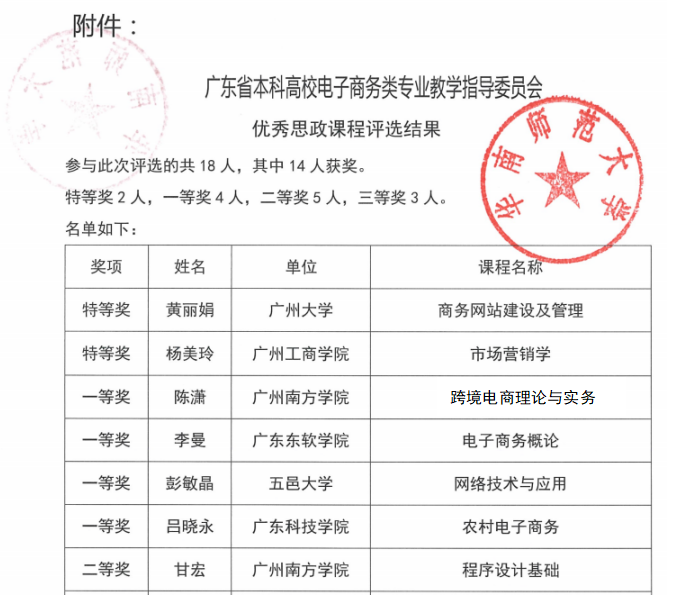 广东省本科高校电子商务类专业教学指导委员会优秀思政课程和教学改革项目名单于近日公布,公司陈潇老师团队的《跨境电商理论与实务》课程荣获一等奖,甘宏副教授团队的《程序设计基础》课程荣获二等奖。同时毛锦庚老师的“后疫情时代基于OMO《网站建设与管理》教学模式研究”获批一般类教学改革项目。