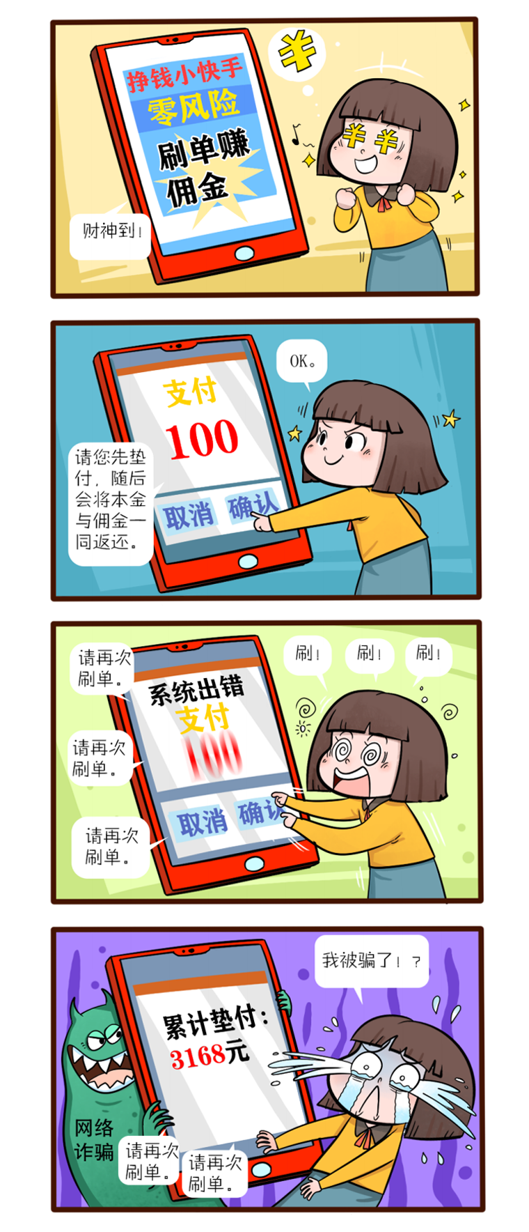 该类诈骗起初会如约将刷单的本金和佣金打入兼职者账户,随着兼职者慢慢入套,刷单的金额越来越大,诈骗分子会以卡单、账户异常等借口为由无法将本金和佣金打入兼职者账户,后继续哄骗兼职者投入更多的资金用于刷单解锁账户。