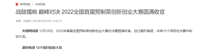 12月16日,2022年首届全国预制菜创新创业大赛总决赛圆满收官。经过激烈角逐,公司博之选团队获得首届全国预制菜创新创业总决赛金奖。