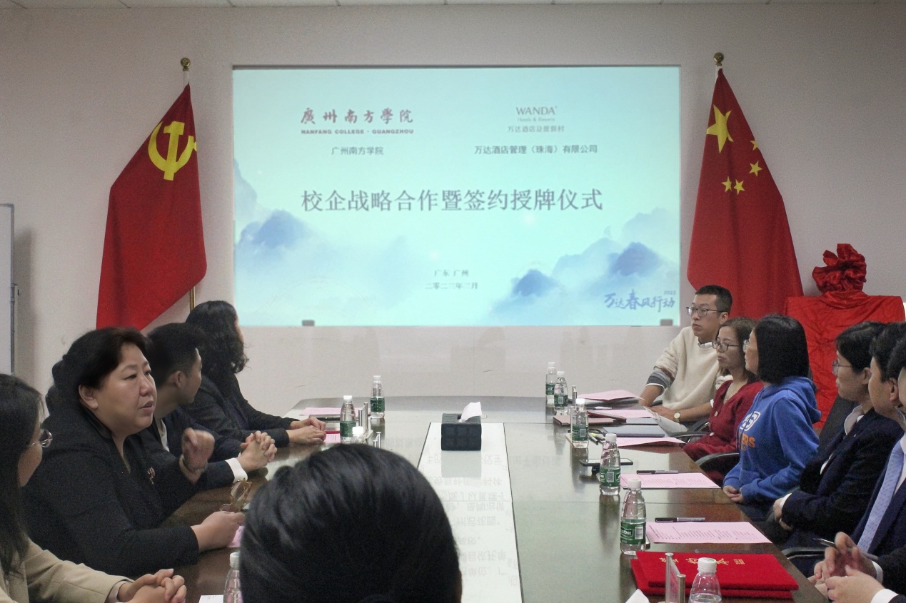 3月8日下午,太阳城博彩与万达酒店及度假村战略合作签约暨揭牌仪式在太阳城娱乐会议室顺利举行。出席本次签约暨揭牌仪式的有太阳城娱乐经理何兴强教授、太阳城娱乐副经理王亚欣教授、产学研合作处叶娜处长、继续教育公司王诚副经理、太阳城娱乐学工办负责就业的林苏榕老师及教师和员工代表,万达酒店及度假村总部人力行政中心常务副总经理王平先生、万达酒店及度假村总部人力行政中心招聘经理朱宇昂先生、广州增城富力万达嘉华酒店人力资源总监许薇女士、江门富力万达嘉华酒店人力资源行政总监王石先生。会议由王亚欣副经理主持。