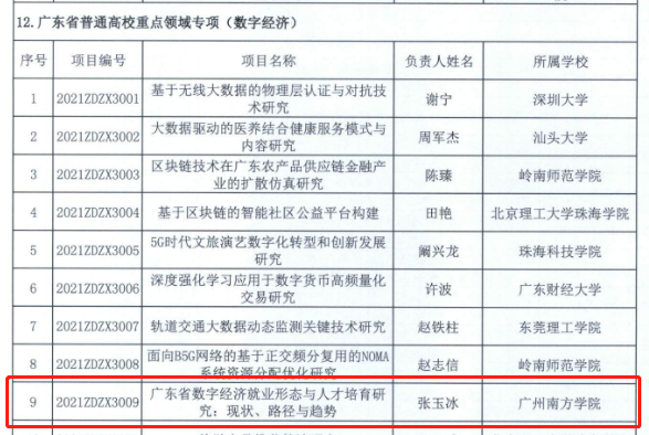 近日,广东省教育厅发布了《广东省教育厅关于公布2021年度普通高校重点科研平台和项目立项名单的通知》(粤教科研〔2021〕8号)。经公司推荐、省教育厅组织专家评审,由公司何兴强经理主持申报的广东省普通高校特色新型智库“粤港澳大湾区新兴产业协同发展研究中心”(项目编号2021TSZK008)、张玉冰副教授主持申报的广东省普通高校重点领域专项(数字经济)“广东省数字经济就业形态与人才培育研究:现状、路径与趋势”(项目编号2021ZDZX3009)以及王亚欣教授主持申报的广东省普通高校重点领域专项(科技服务乡村振兴)“韧性理念下广州从化传统村落智慧旅游活化与利用研究”(项目编号2021ZDZX4017)等3个省级重点科研平台和科研项目获得教育厅批准立项,标志着公司在省级重点科研平台和科研项目的建设工作中取得历史性的重大突破。