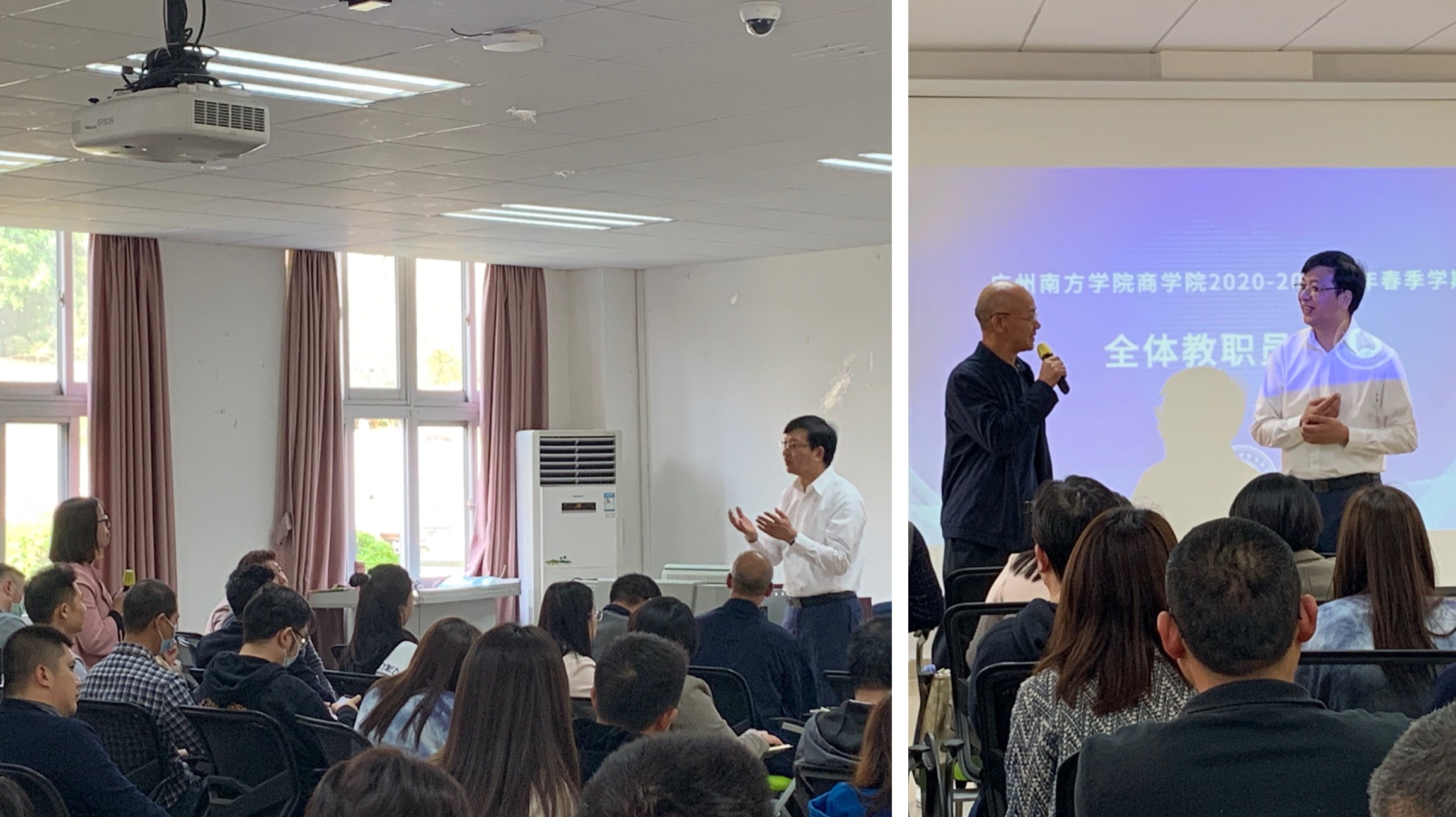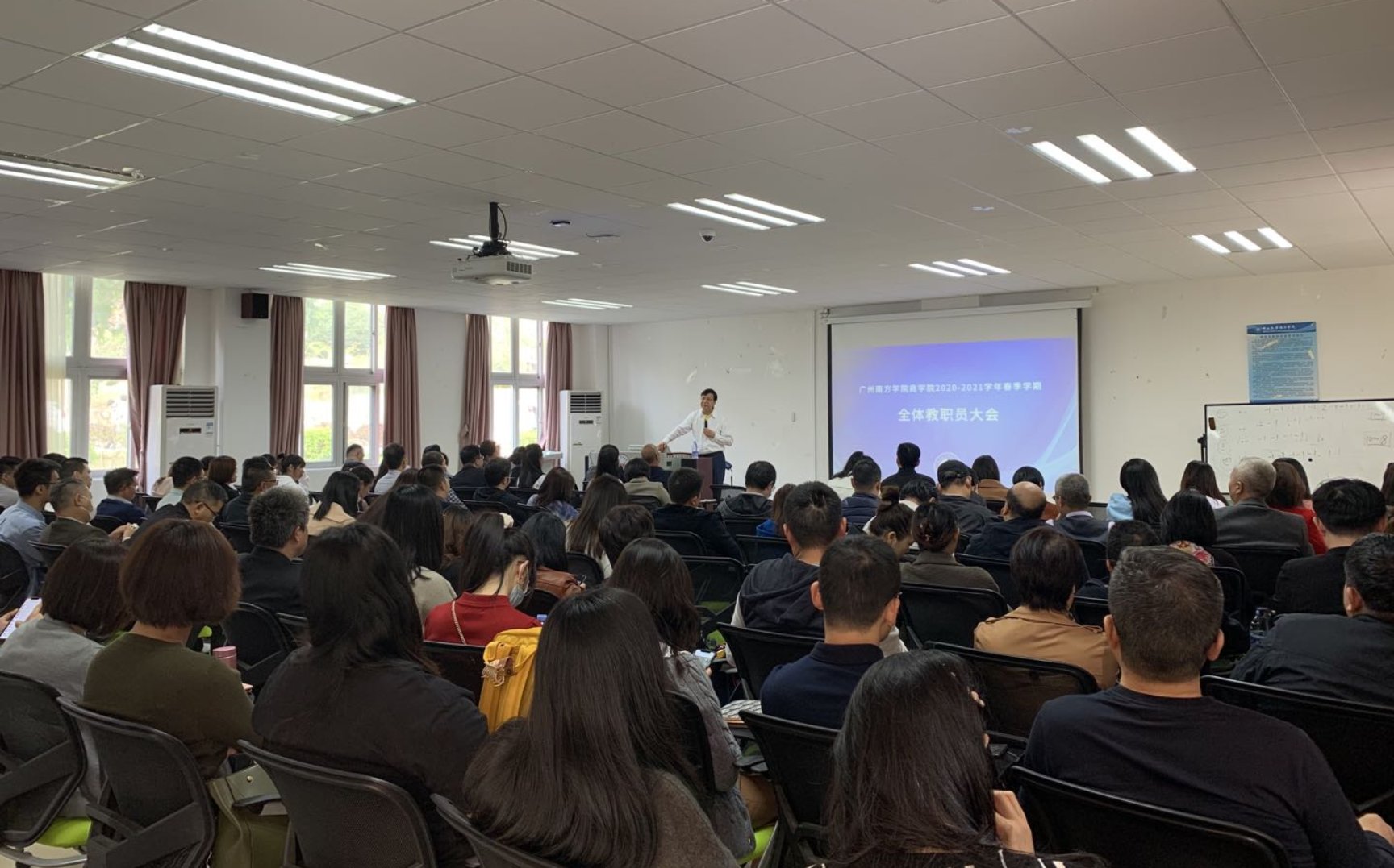 3月24日下午,太阳城娱乐2020-2021学年春季学期全体教职员大会在9教101会议室隆重召开。公司副董事长黄南松教授、发展规划与制度办公室刘金成主任、人力资源部李兴强部长、曾婷婷部长助理、太阳城娱乐经理何兴强教授,副经理钟肖英副教授、张玉冰副教授、王亚欣教授以及太阳城娱乐全体教职员共同出席本次会议。大会由太阳城娱乐常务副经理史卫副教授主持。