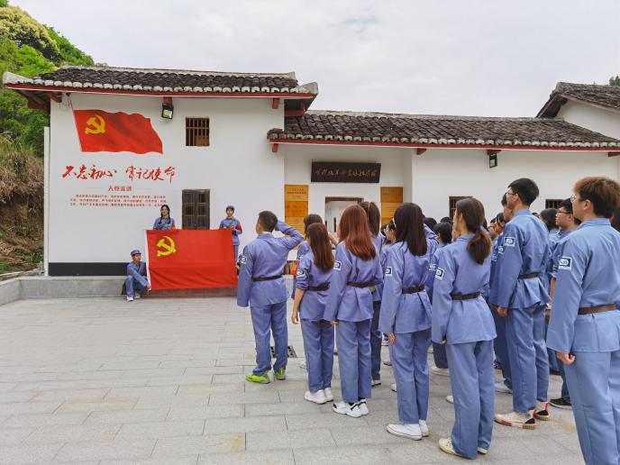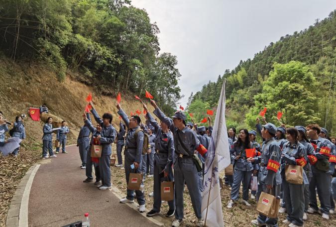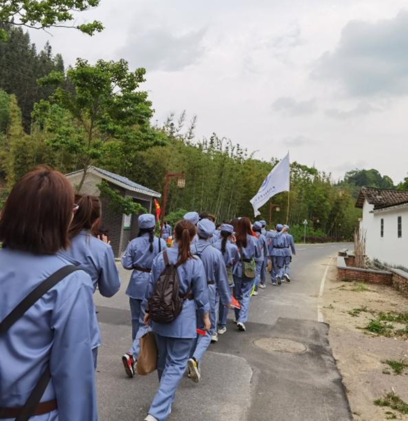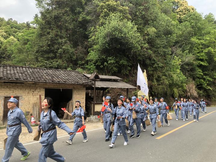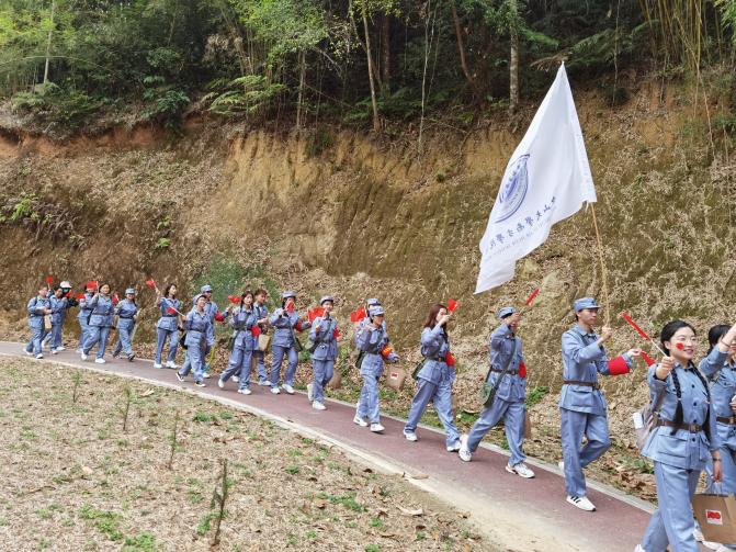 历史是最好的教科书,也是最好的清醒剂。在行军途中,为了让全体党团成员厘清历史脉络,认清历史事实,沐浴红色洗礼,厚植爱党爱国情怀。以小组为单位开展党史问答,党员们积极认真思考,开拓思维,全力以赴,以自信的姿态、专业的学识去回答每一道题目。无论是党员还是团员都积极互动,现场反响热烈,为紧张刺激的问答环节增添了不少趣味性。在轻松愉快的氛围中亲近自然,并理解了团队协作的重要性。经过一番休整再次出发前往黄沙坑革命旧址纪念馆,党员高高举红旗、唱军歌,嘹亮的军歌一路飘扬在“红军游击小道”上。