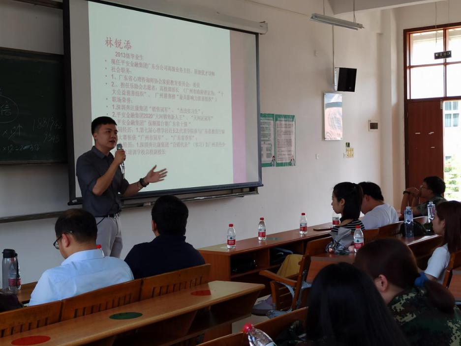 最后,2013级毕业生代表林锐添出场,他现任平安金融集团广东分公司高级业务主任,他用互动的方式让新生思考了很多问题,令现场气氛达到高潮。他鼓励新生在读书阶段找准未来奋斗的方向,无论是什么选择,不要空想,脚踏实地的去学习、去努力、去奋斗,不要浪费任何的机会。他还鼓励新生多参加社团,员工会等组织,养成不怕吃亏,踏实干的习惯。