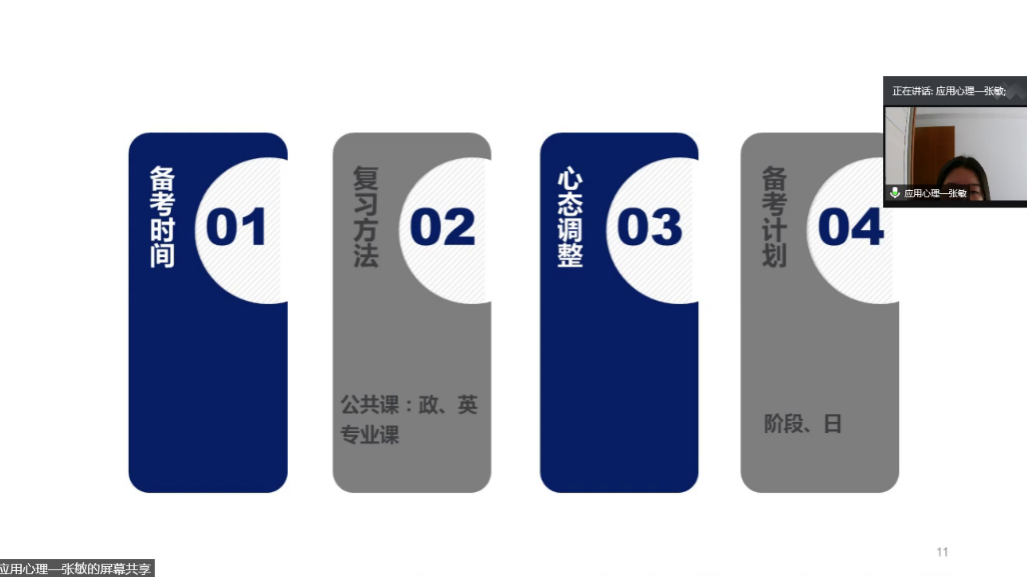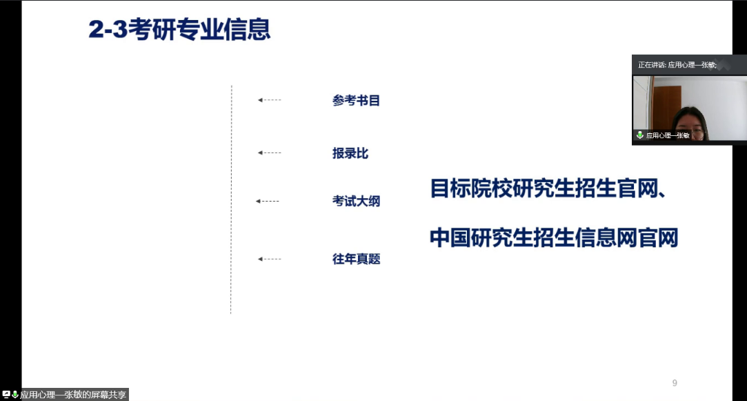 7月12日下午3时,太阳城娱乐考研分享会于线上顺利举行。2014级张敏学姐受邀担任主讲嘉宾,向在校员工分享考研经验与心得。