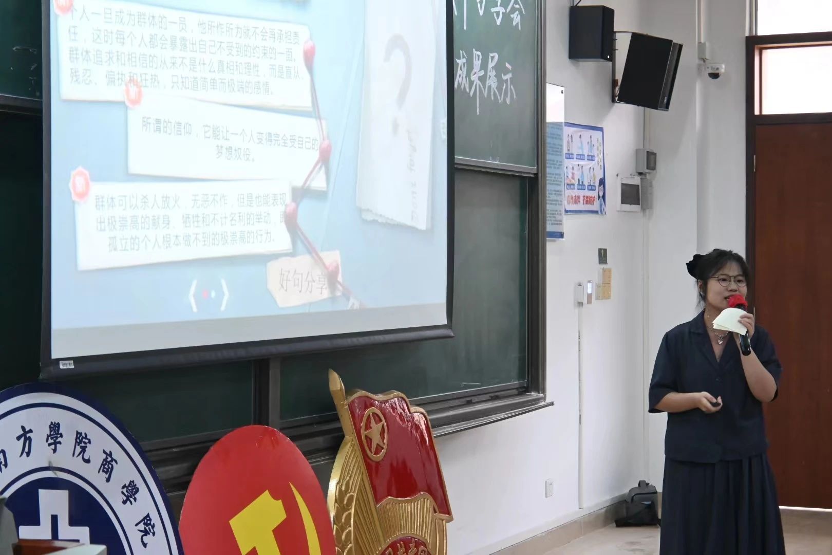 林俊娥同学结合电影《周处除三害》、校园霸凌事件等热点事件,分享自己对《乌合之众》的感悟,“在这个互联网群魔乱舞的时代,我们人人都是乌合之众,我们的观点可能被群体吞没,或者覆盖,但是我们依旧还是要保持独立思考的能力,思想是靠自己喂养出来的,保持独立思考,审视权威,才有可能带来积极的改变。”