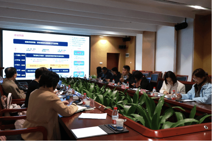 接着,管理工程系主任甘宏教授围绕京东产业公司建设作专题汇报。他详细梳理了公司十年发展脉络:2012年电子商务专业设立之初即锚定产教融合方向,2017年与京东集团启动“跨境电商联合培养计划”,2021年正式与京东成立产业公司,2025年入选新一批省级示范性现代产业公司,逐步构建起“校企双主体协同育人”模式。目前,公司已形成“12244”特色体系——以1个省级教学团队为核心,打造数字化产教融合平台与仿真实验教育基地2大载体,贯通“真实项目轮岗、创业孵化、竞赛转化、岗位认证”四阶培养路径,建成跨境电商产业融合基地、教师培训基地等4类实践中心。